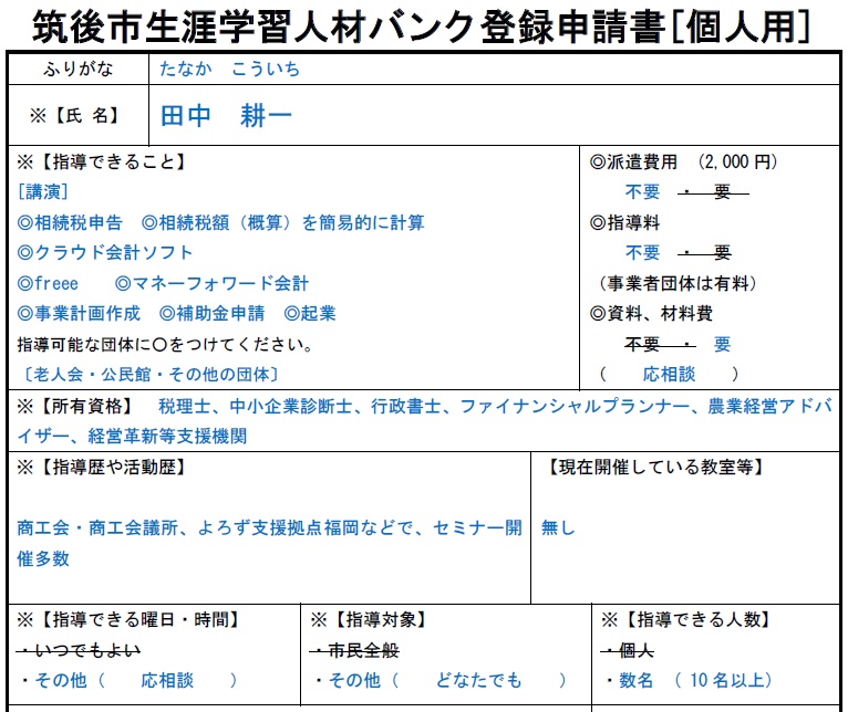 なお、「筑後市生涯学習人材バンク登録」制度は、市民のための学習を目的にしておられると思い、交通費程度の費用としています。費用の欄があったので金額を書きましたが、ボランティア活動と思っていますので(資料をそちらで印刷していただけるのであれば)無料でも構いません。